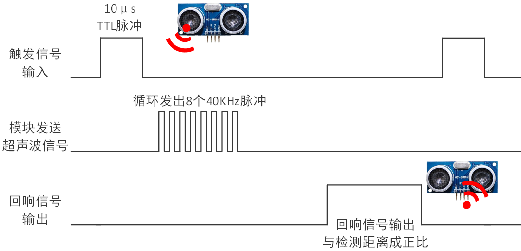 Trig引脚输入一个1微秒的脉冲信号。雷达接收到信号后会向外发送一个40KHz的超声波。