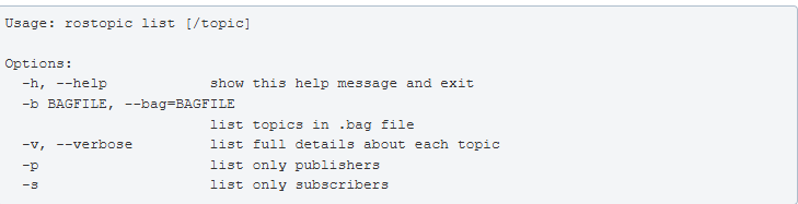 - 使用帮助选项(-h)查看可用的rostopic的子命令